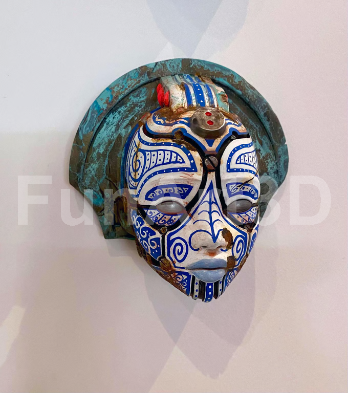 La "Máscara del Chamán Místico" es una pieza decorativa fascinante que forma parte de nuestra colección "Esencia Ancestral". Esta máscara presenta intrincados patrones en azul y blanco, con acentos en rojo, creando un diseño simétrico de motivos ondulantes y formas geométricas que le dan un aspecto tradicional o tribal. Está montada sobre un fondo circular verde azulado y envejecido, que resalta su carácter artístico y antiguo.